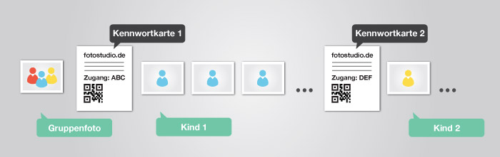 • Jeder Schulanfänger wird zuerst mit der Kennwortkarte fotografiert, die seinen individuellen QR-Code enthält. Alle weiteren Fotos desselben Kindes benötigen keine Kennwortkarte mehr.