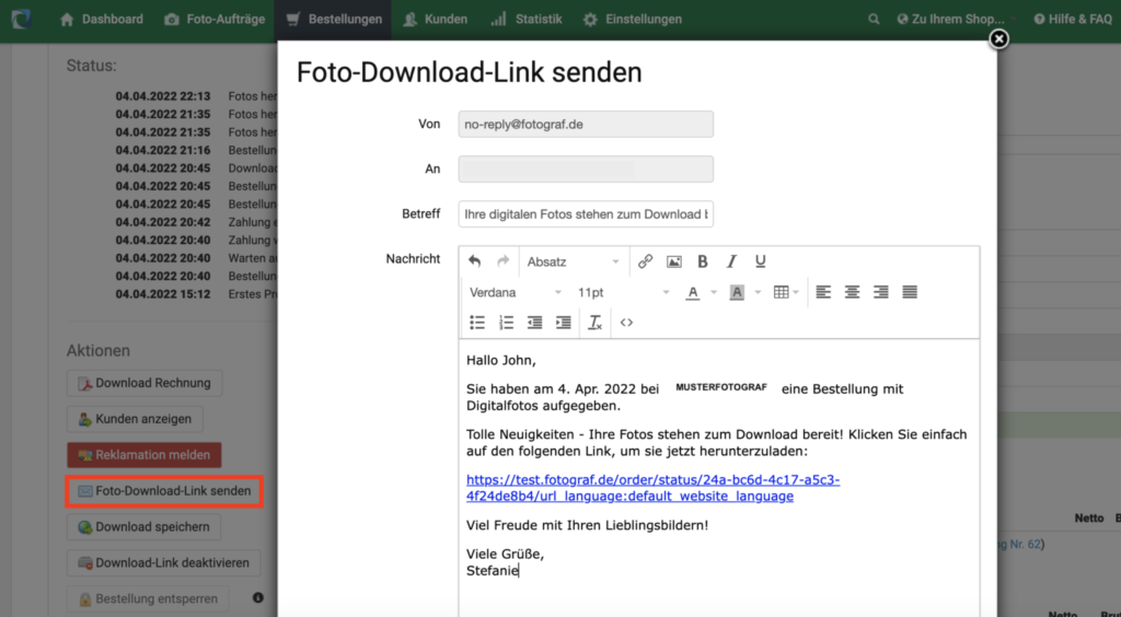 Um in Zukunft noch mehr Zeit und Arbeit zu sparen, kannst du deinen Kund:innen direkt aus der Bestellung heraus eine E-Mail mit dem Link zu Ihrem Fotodownload senden.